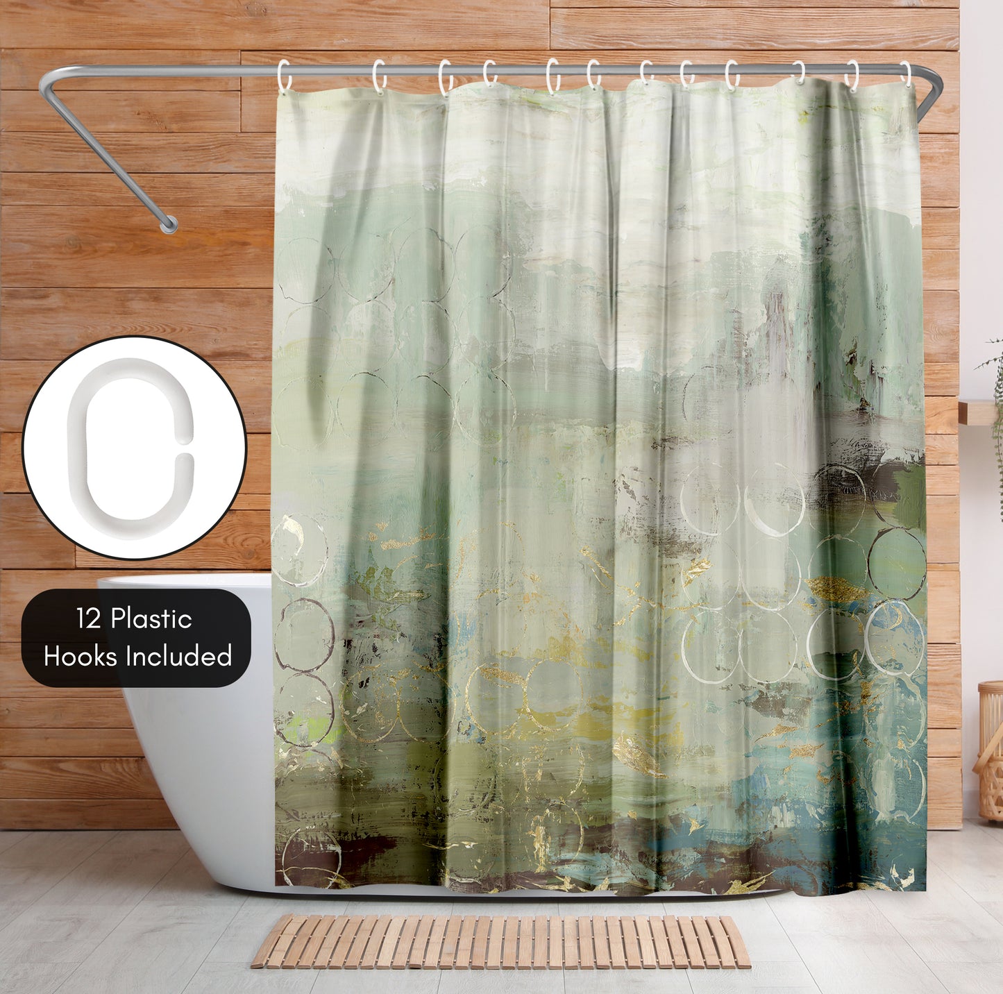 71x74 Shower Curtain with 12 Metal Grommets | Muted Green and Gold Accents