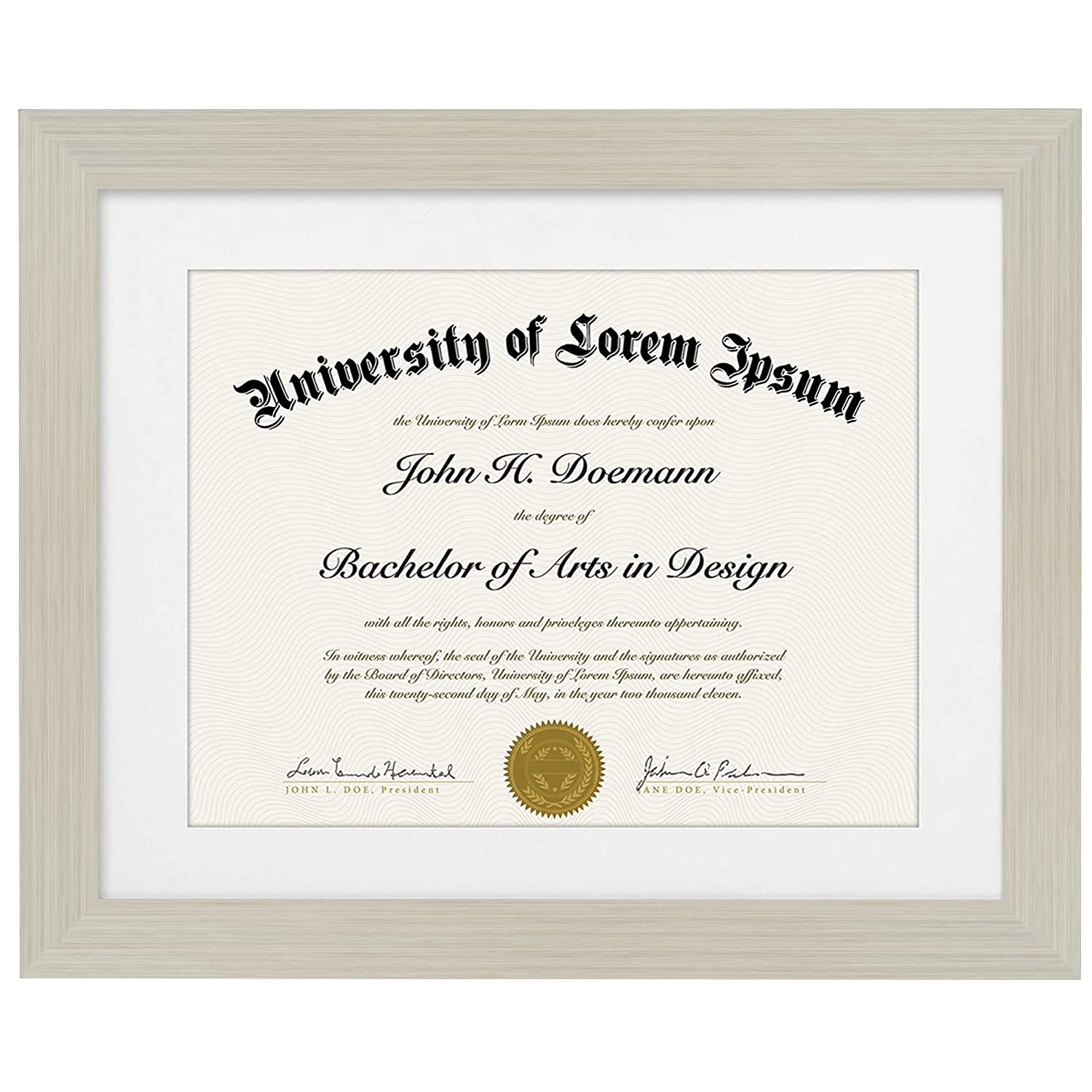 Needed a frame bigger than what seems to be the standard bachelors degree size. My degree is 11 x 14, lucky for me the white frame part comes out and I still get to use the frame.Came in excellent condition, packaging was fitting for what it contained.