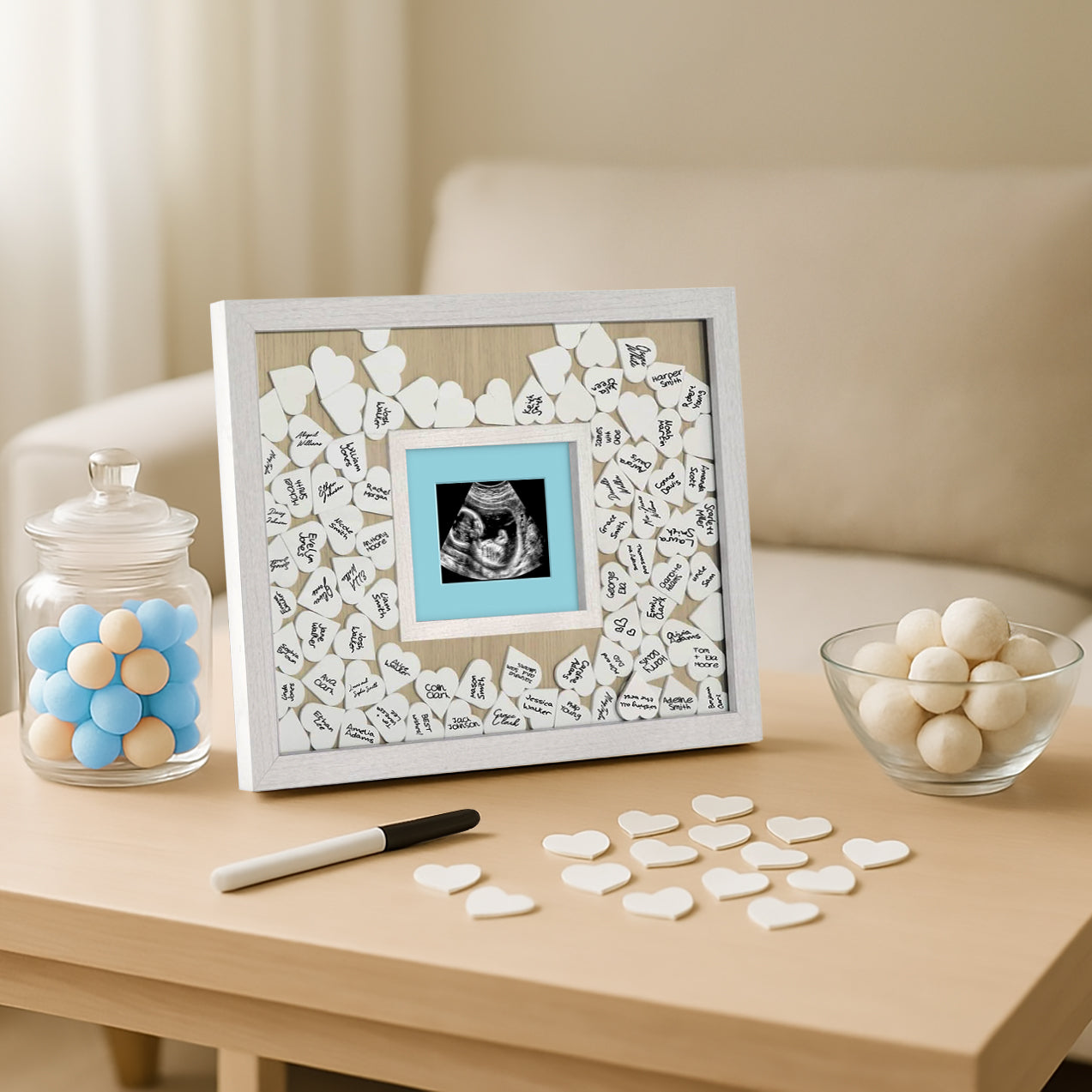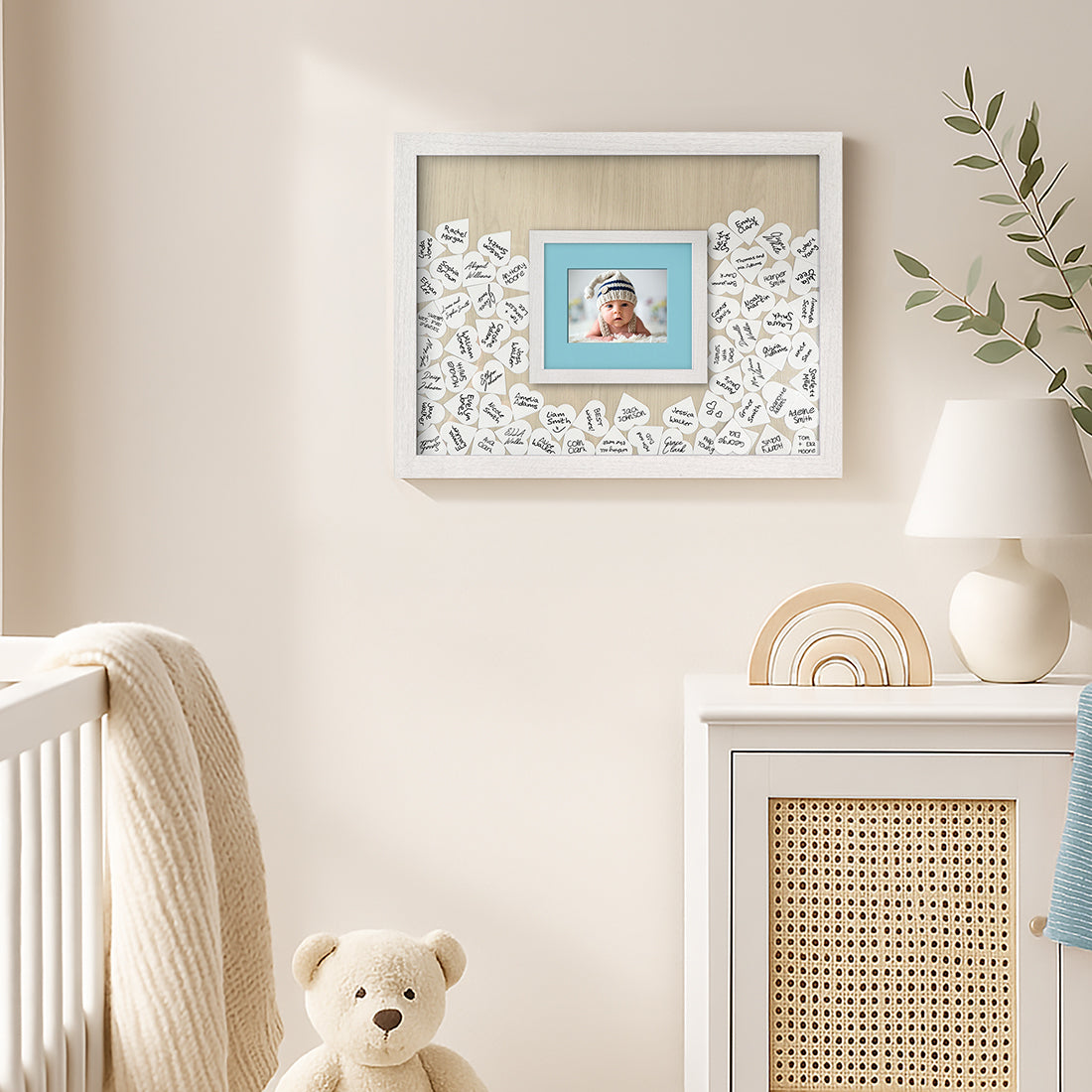 Americanflat 12x16 Baby Shower Guest Book with Pink and Blue Mats | Includes 80 Heart Tokens | White