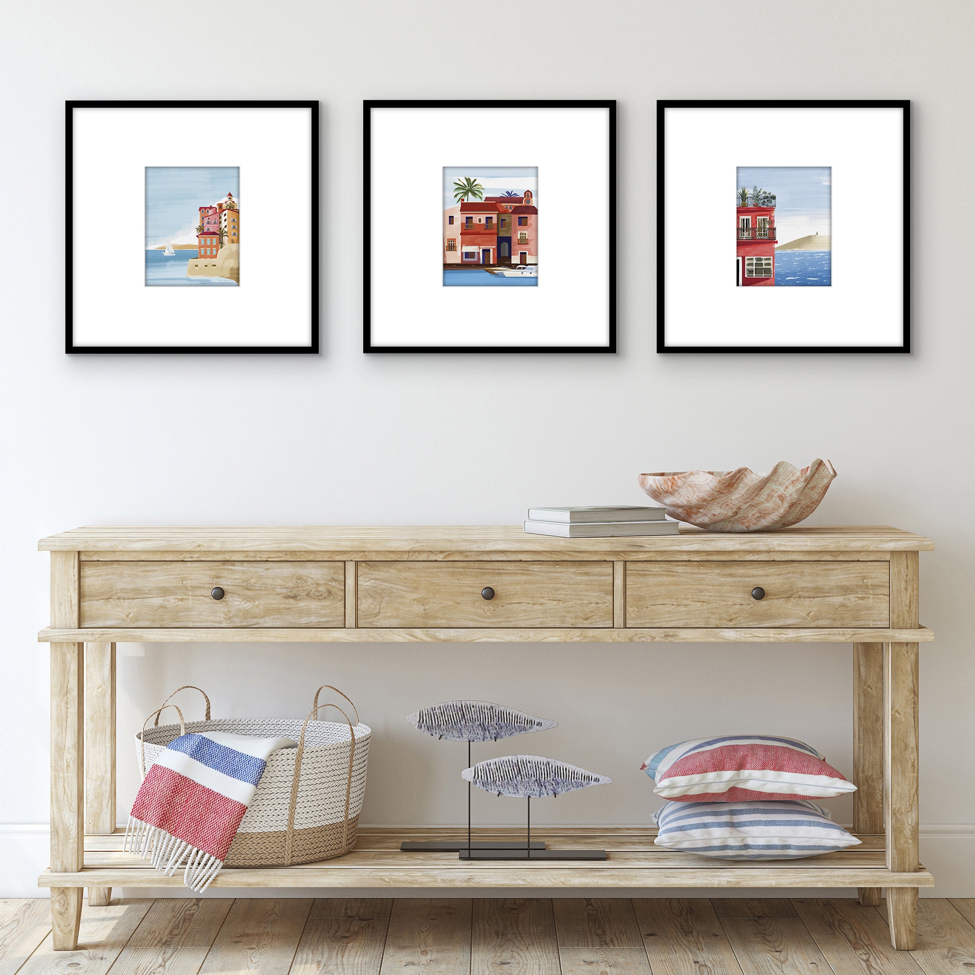 I am extremely impressed with the quality of the prints and frames. It was shipped UPS straight from the store in NY. The colors are amazing (can’t tell so much from the photos) and I’ve received lots of compliments. Hardware is already attached so you just need the nails.