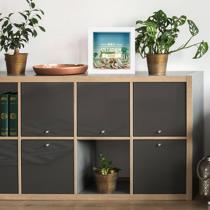 So easy to display artwork, pictures, notes, etc. just open the front display door, insert item into holding bands, and shut door. Love that you can easily change the displayed item as needed.